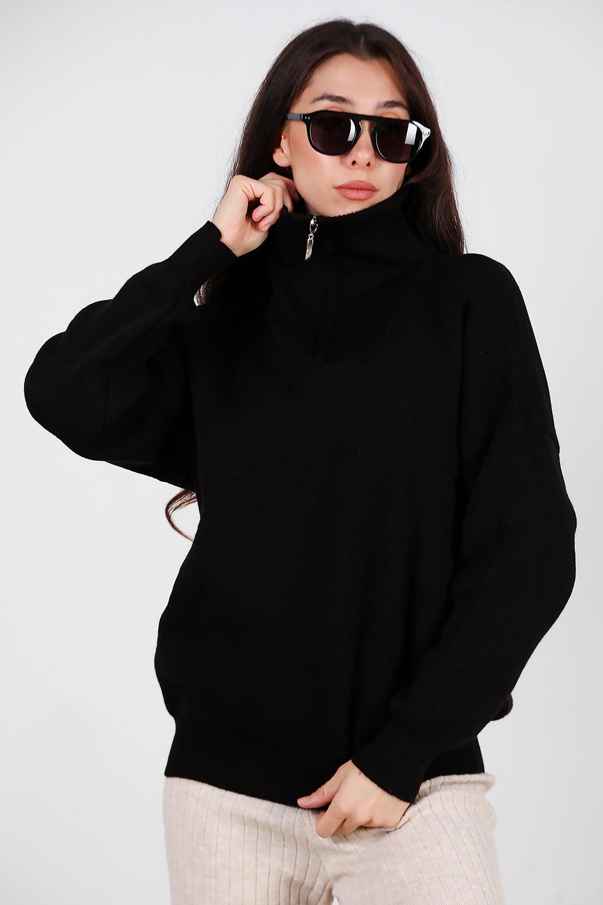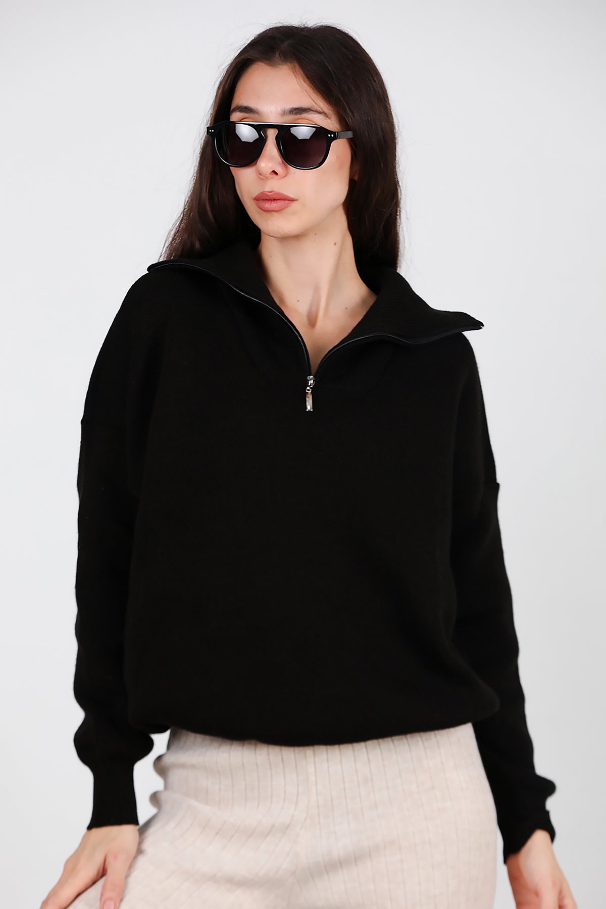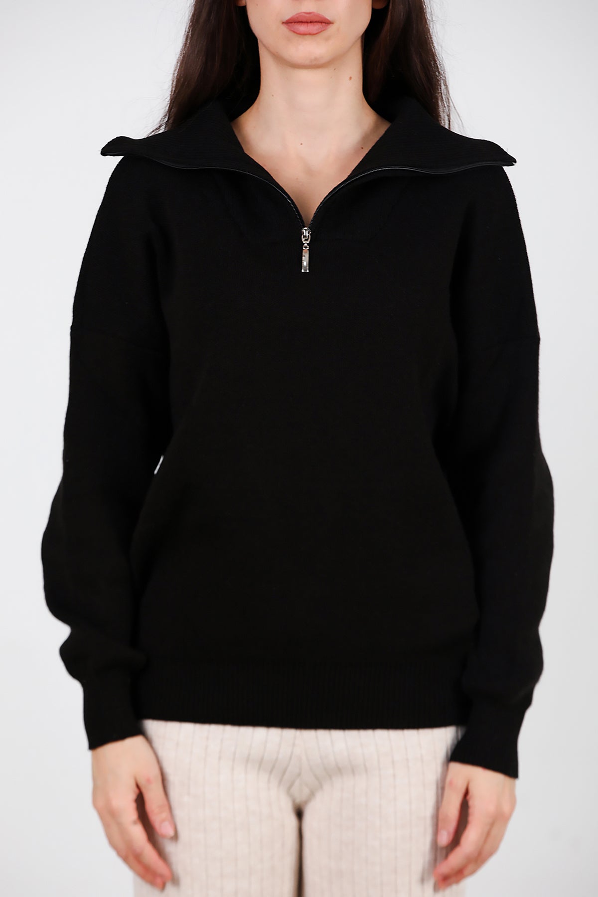 Kadın Yarım Fermuar Kazak Siyah