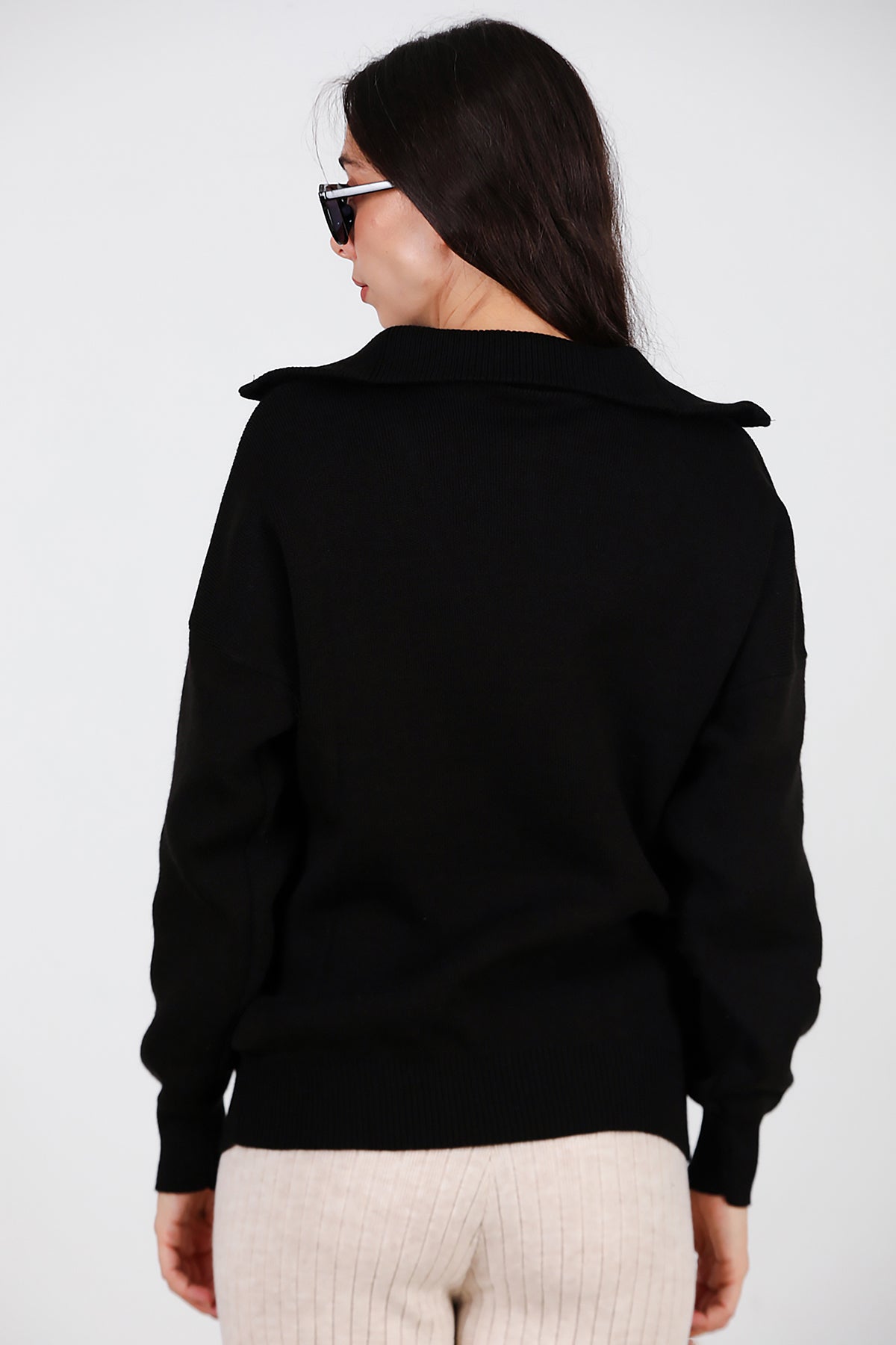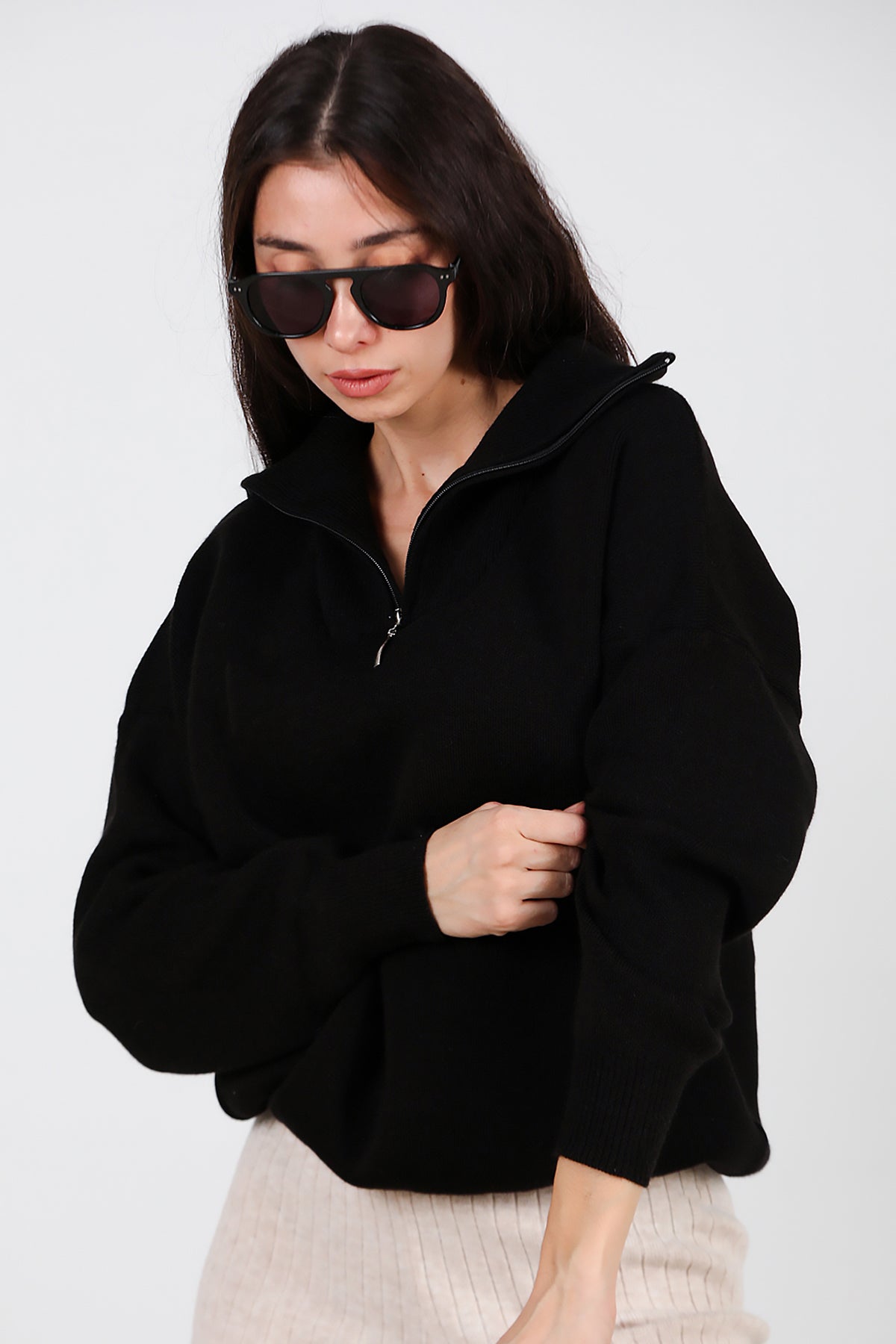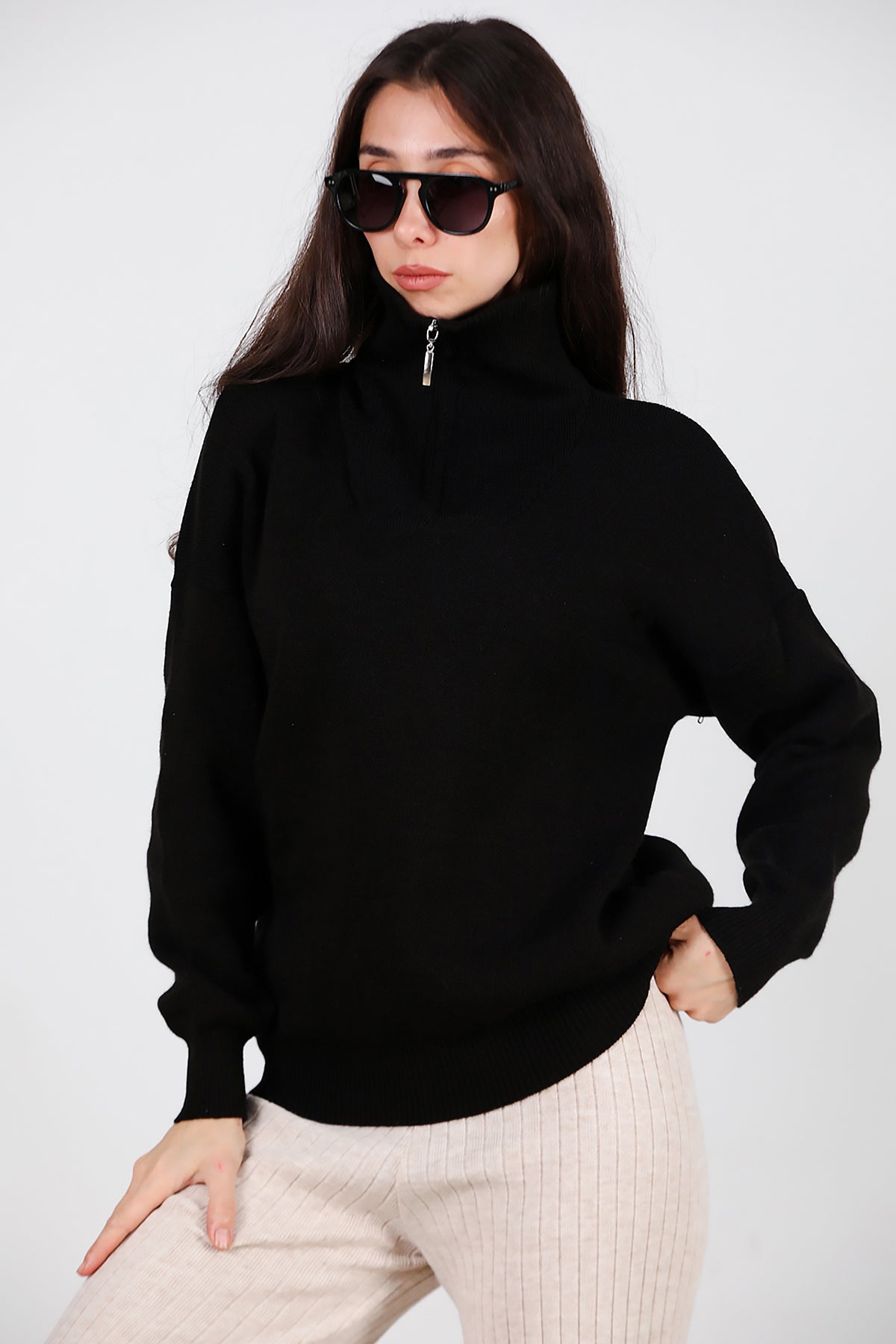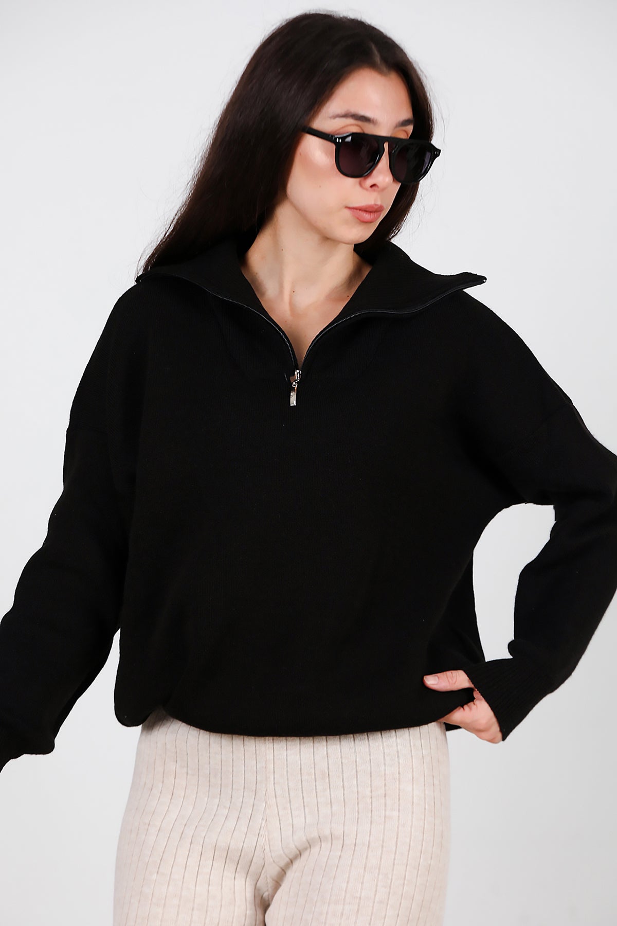Kadın Yarım Fermuar Kazak Siyah