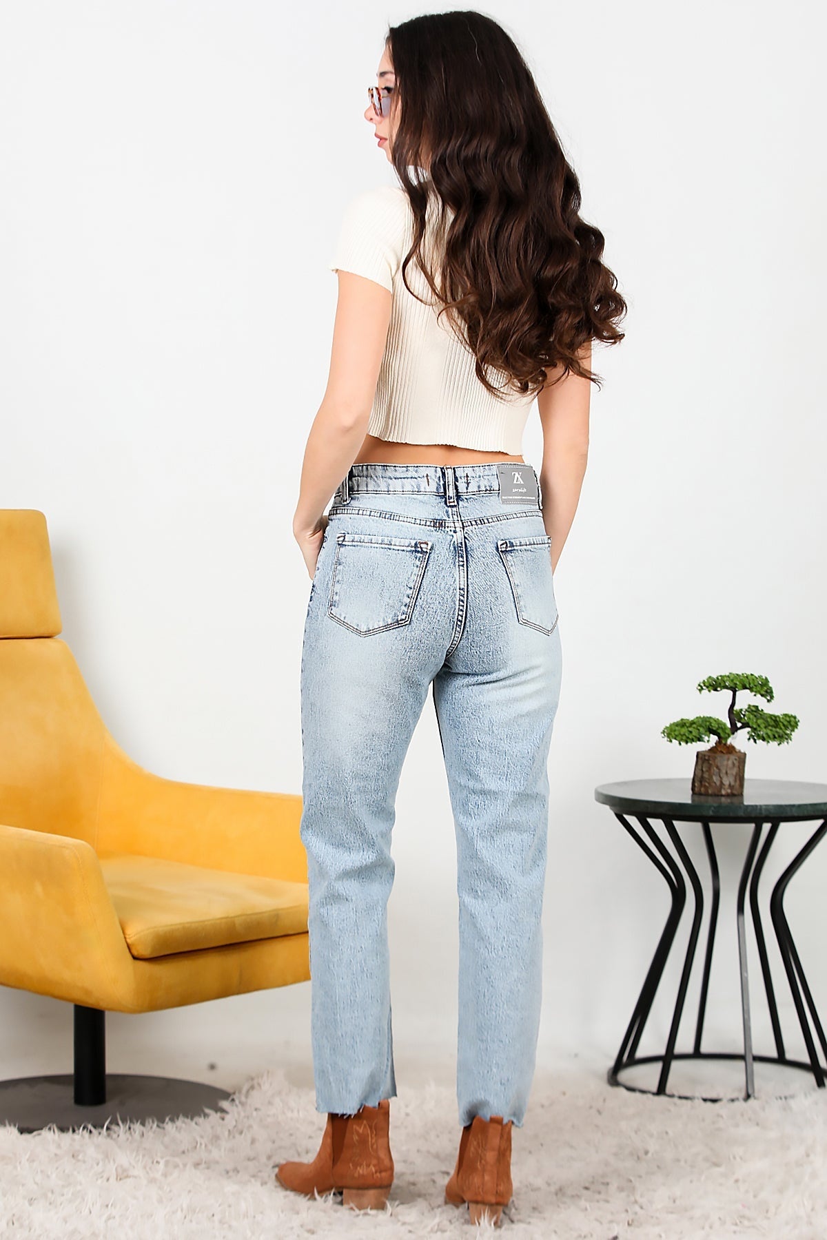 Kadın Yıpratmalı Paçası Crop Kot Pantolon Mavi