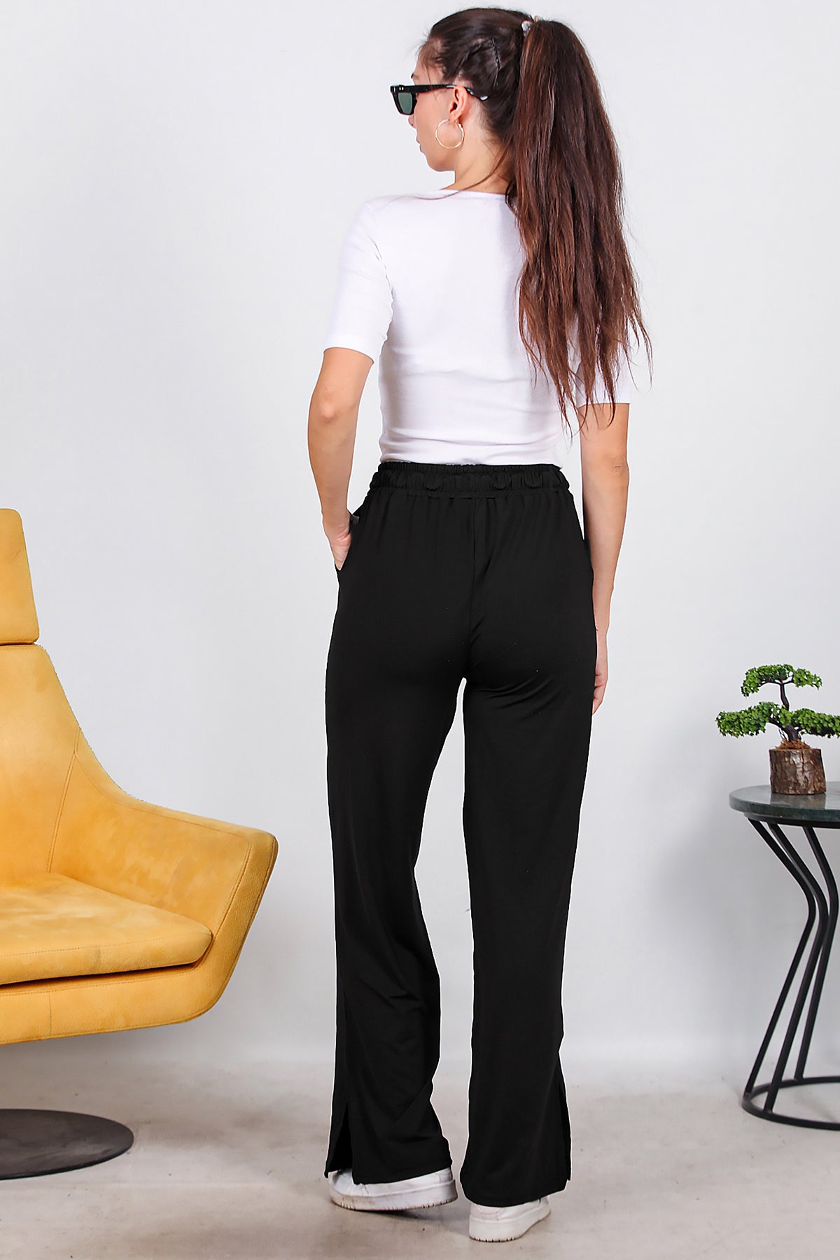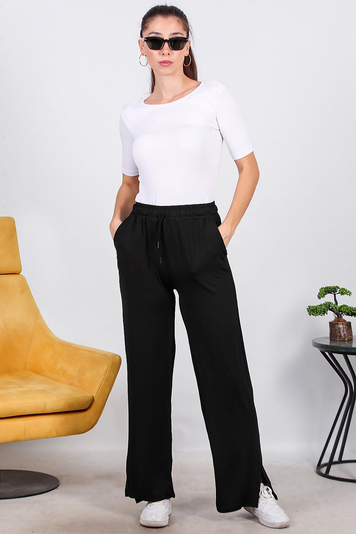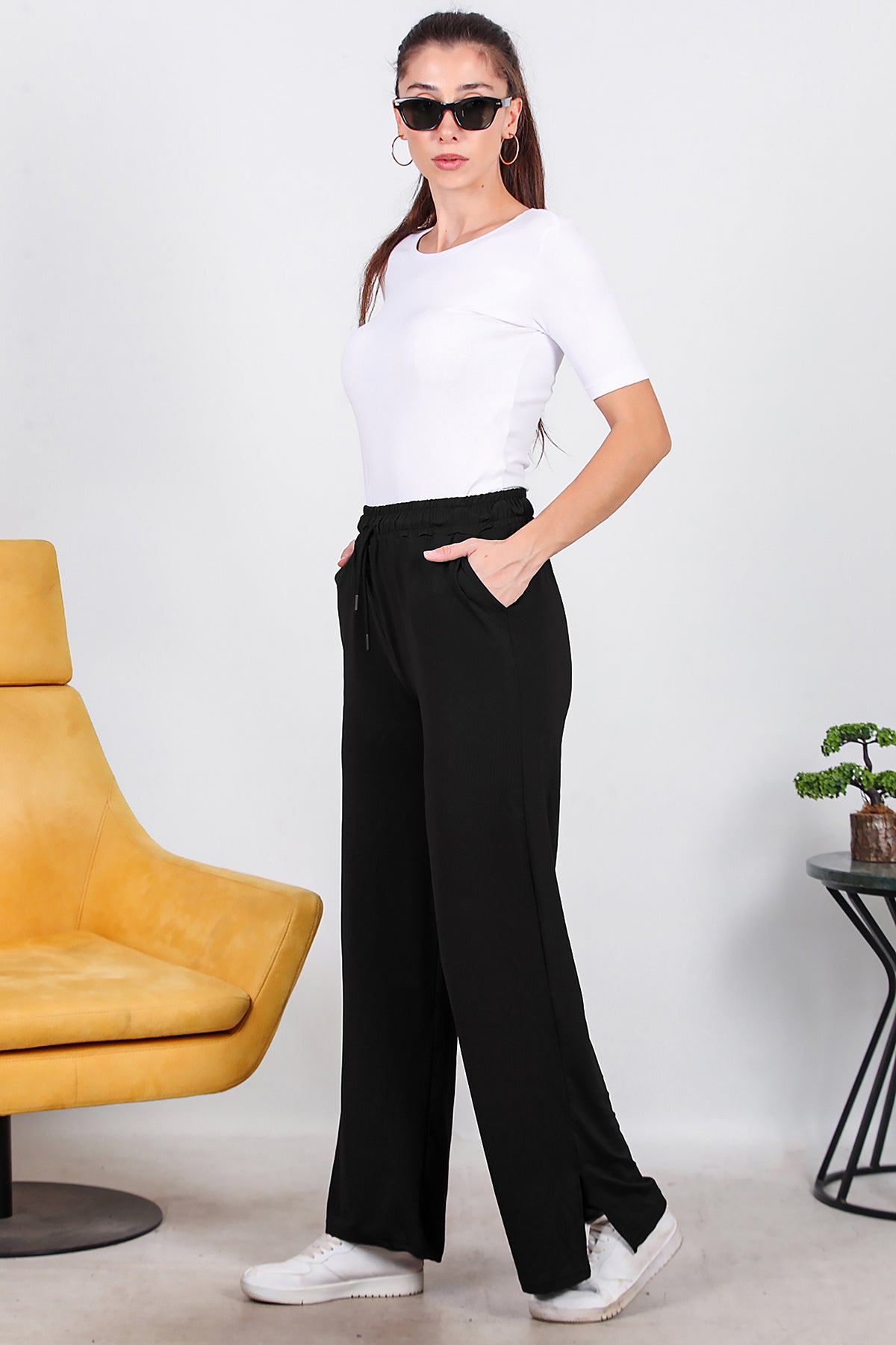 Kadın Yırtmaçlı Bol Paça Pantolon Siyah
