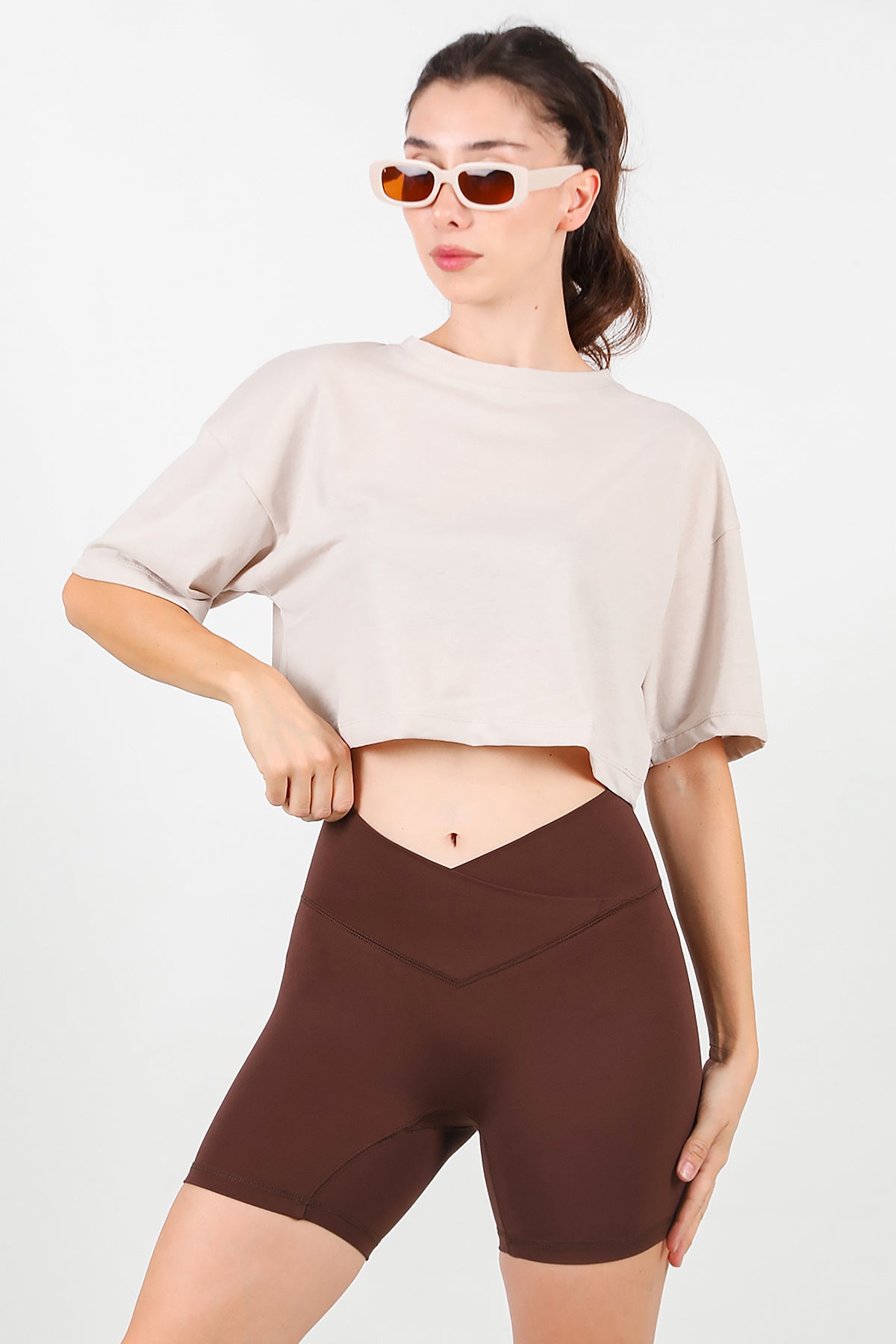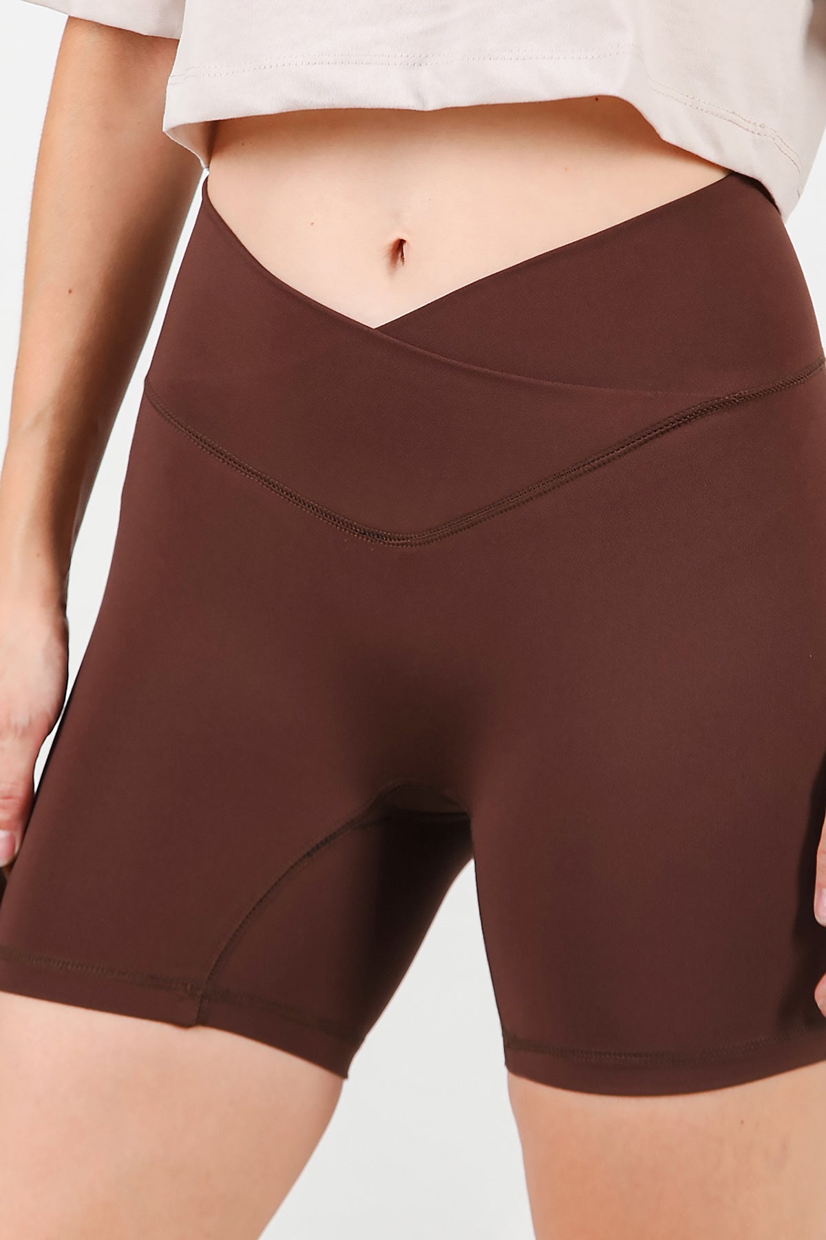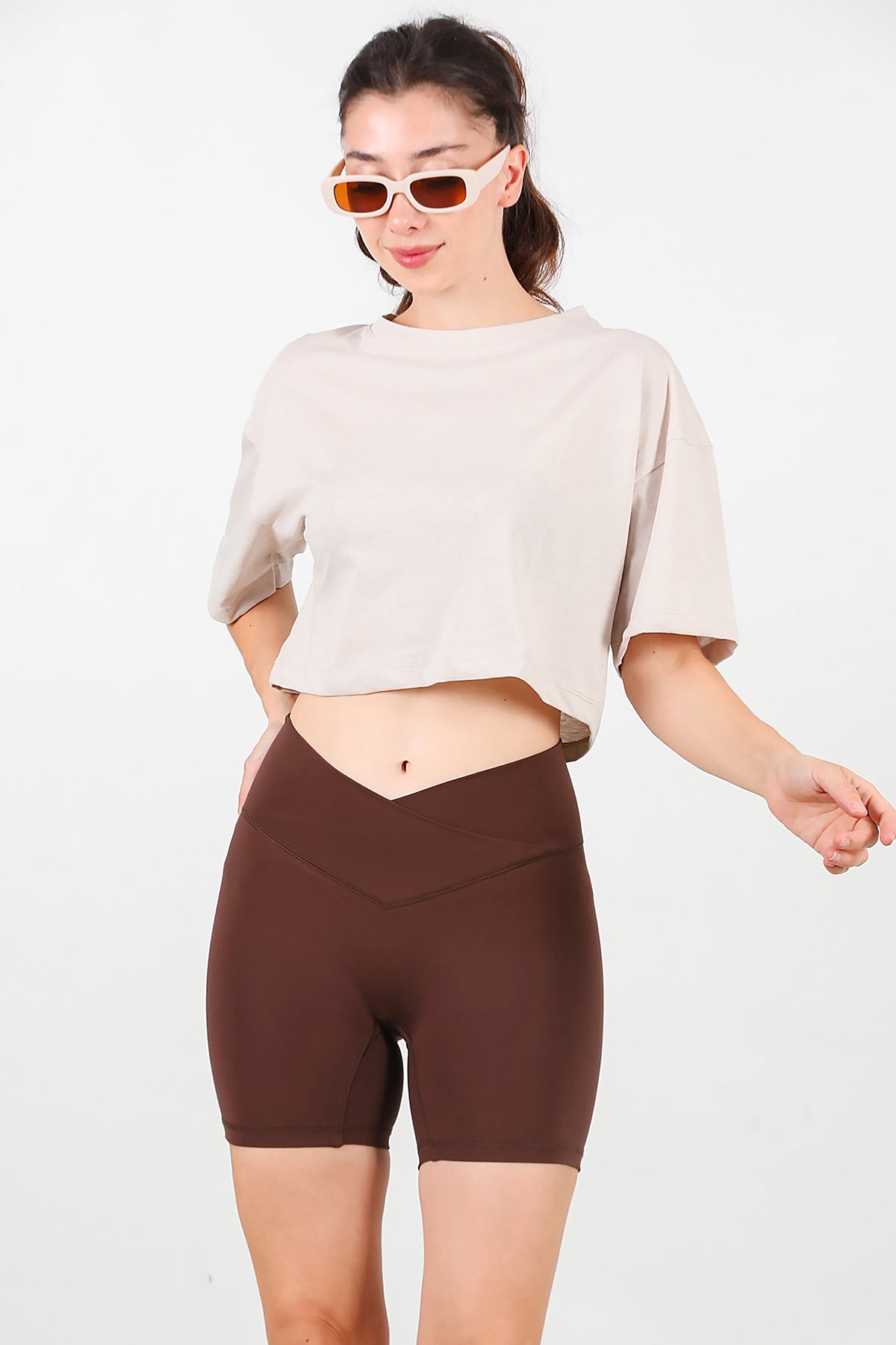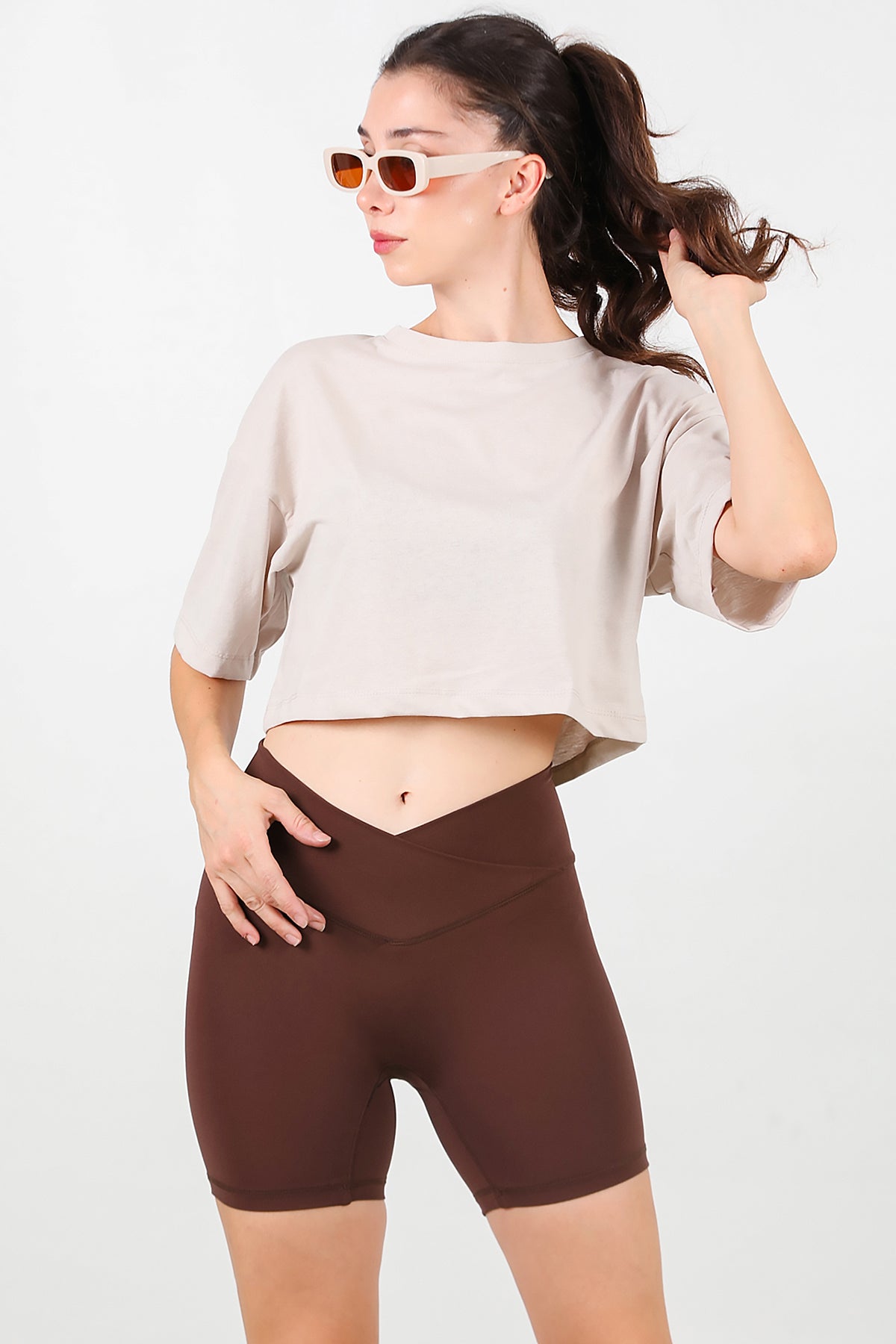 Kadın Yüksek Bel Çapraz Lastikli Şort Kahverengi